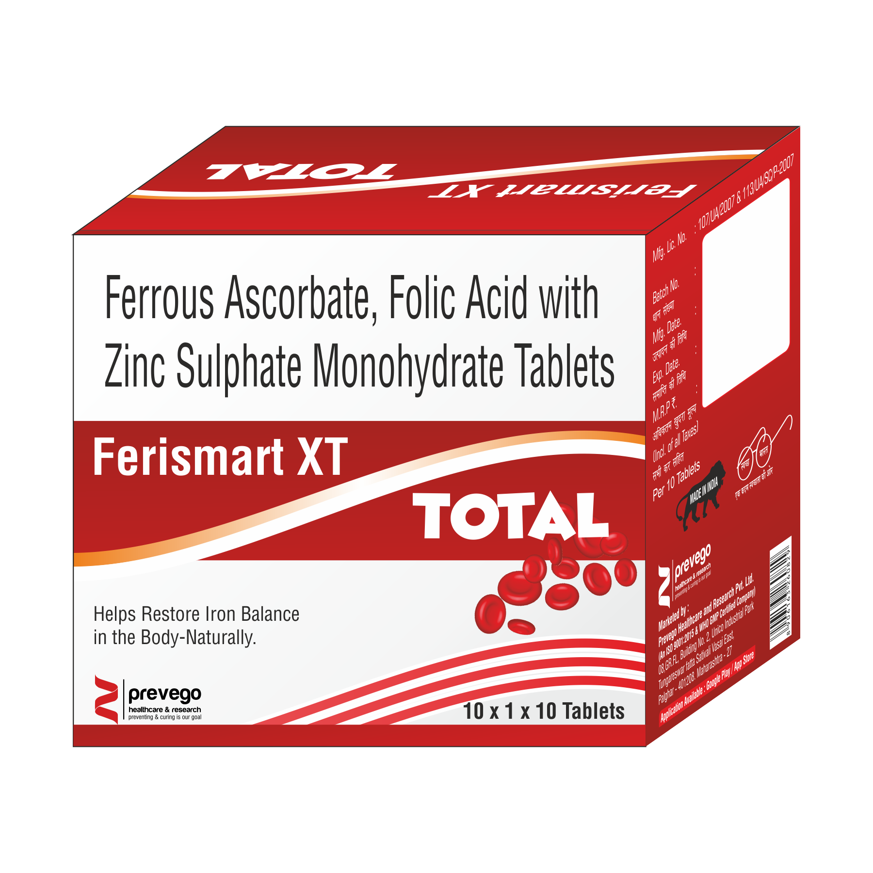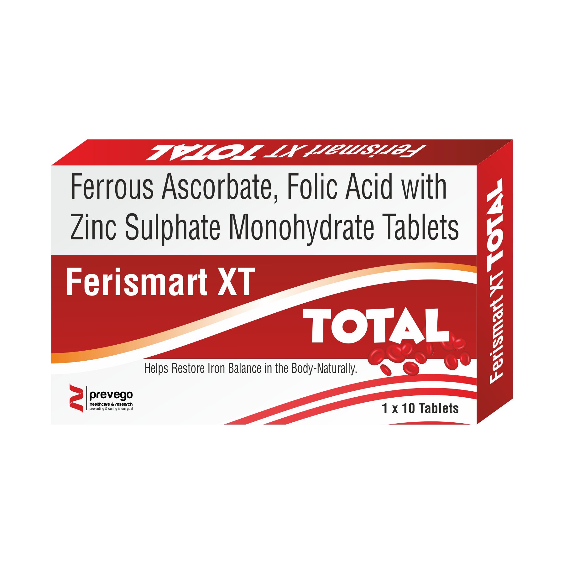 FERISMART XT TOTAL Tablet has a combination of medicines which is used in the treatment of iron deficiency. It works by replenishing the iron stores in your body and corrects iron deficiency (anemia) by enhancing the absorption of iron in the body. It also helps in the formation of red blood cells.