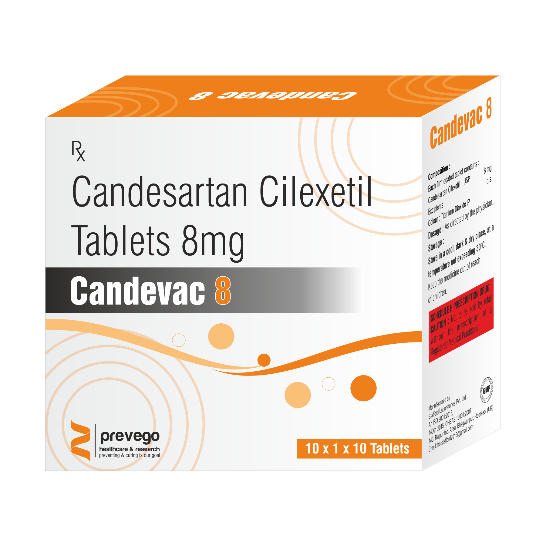 CANDEVAC 8mg Tablet is a medicine used to treat high blood pressure and heart failure. Lowering blood pressure helps to prevent future heart attacks and stroke. This medicine is also effective in preserving kidney function in patients with diabetes.