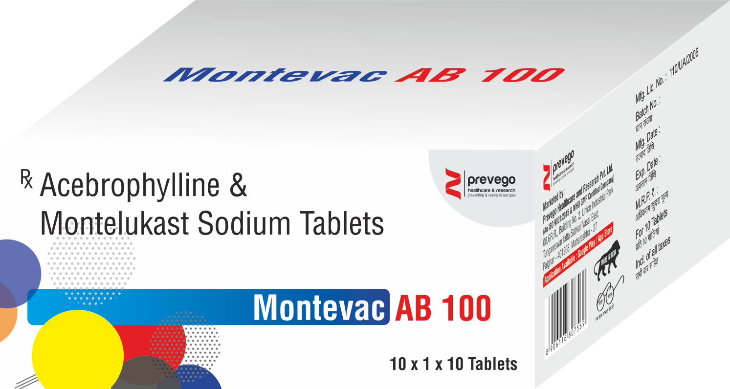 MONTEVAC AB 100 Tablet helps prevent and treat asthma and chronic obstructive pulmonary disorder (COPD). It may also help relieve allergy symptoms such as runny and stuffy nose, sneezing, watery eyes, congestion, or stuffiness. It helps relax the muscles of the air passages thereby making it easier to breathe.