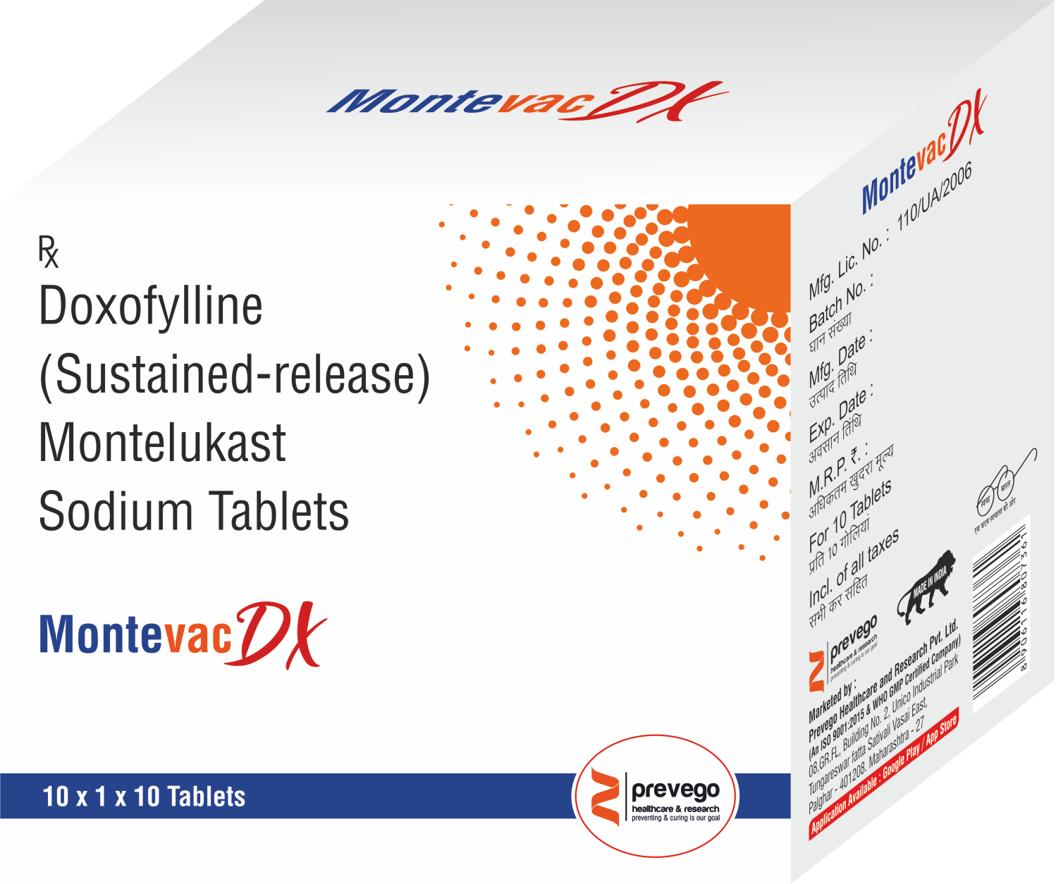 MONTEVAC DX Tablet helps prevent and treat asthma and chronic obstructive pulmonary disorder (COPD). It may also help relieve allergy symptoms such as runny and stuffy nose, sneezing, watery eyes, congestion, or stuffiness. It helps relax the muscles of the air passages thereby making it easier to breathe.