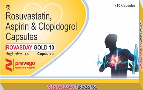 ROVASDAY GOLD 10 Capsule is used for prevention of heart attack. It is a combination of medicines that prevent clot formation in the blood vessels. It also helps to reduce increased cholesterol and triglycerides levels.