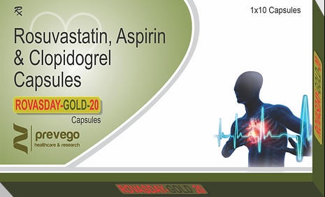 ROVASDAY GOLD 20 Capsule is used for prevention of heart attack. It is a combination of medicines that prevent clot formation in the blood vessels. It also helps to reduce increased cholesterol and triglycerides levels.